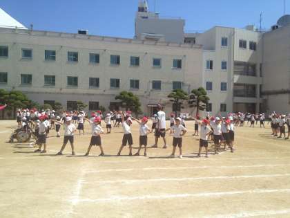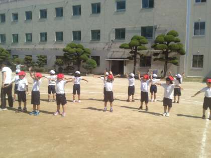 小学校初めての運動会。2年生と一緒に大好きな「さんぽ」や「となりのトトロ」の曲で楽しく踊ります。