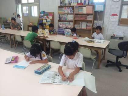 図書室に10人の子どもたちがやって来て、それぞれ自分の課題を始めました。時間を決めて計算問題に取り組む子、読書感想文の下書きメモを考える子、辞書で調べながらプリントをする子、自由研究のテーマ探しで本を読む子など様々です。