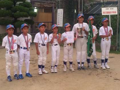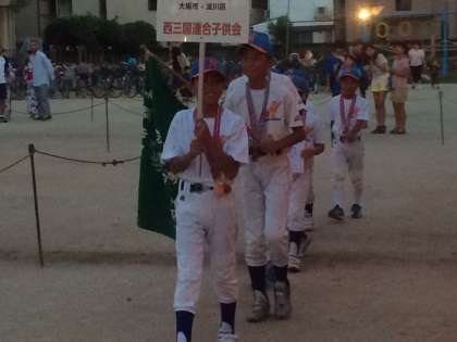 盆踊りが始まる前に子ども会のソフトボールチームが、パレードをしました。ソフトボールチームは、現在7名でがんばっています。7月12日に行われた淀川区の大会で、第3位になりました。只今部員募集中です!
