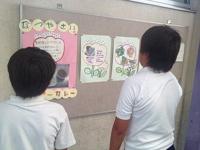 それから、「夏野菜のマーボーカレー」に入っている野菜などを紹介した掲示物を作り、給食室前に貼っています。見てください!(^^)!