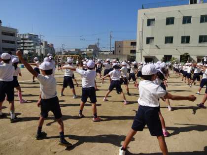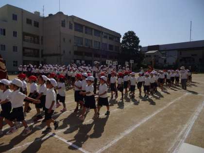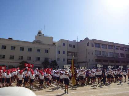 本日、第一回全体練習で、行進、ラジオ体操、運動会の歌、全校競技などの練習をしました。