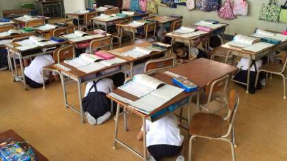 本日行なわれている大阪880万人訓練に合わせて、各教室でも訓練しました。本校屋上スピーカーからの放送と携帯電話のメールを聞いて机の下に体を入れました。万一に備え、訓練しました。