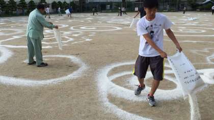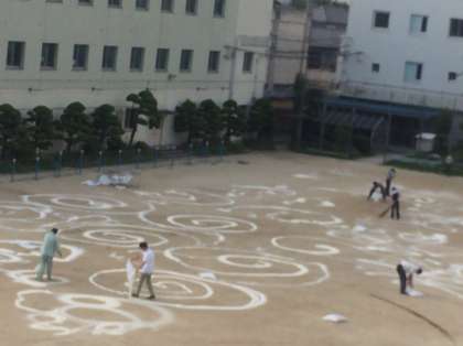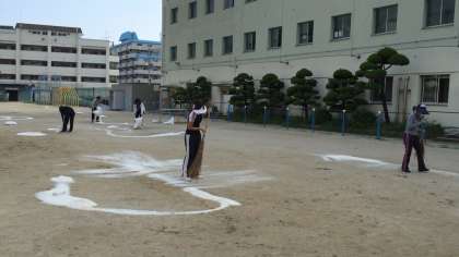 職員作業で運動場ににがりをまきました。運動会に向けて環境を整えました。