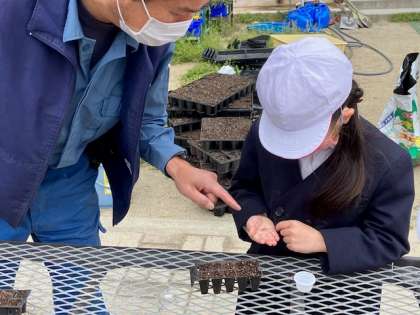 4月24日(月)、3年生は地域とのふれあい活動として、花を種から育てる活動をしました。2年生の時はパンジーを育てましたが、3年生ではマリーゴールドを育てます。今日はその第1回目ということで、地域の花苗ボランティアの皆さん、公園事務所の皆さんに来ていただき、一緒に種をまきました。