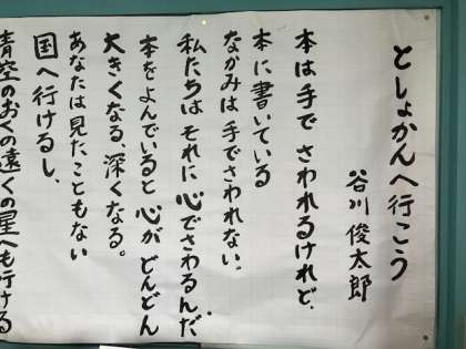 図書館の前に、谷川俊太郎さんの「としょかんへ行こう」という詩が貼ってあります。