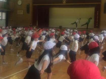 今日から運動会の練習が始まりました。「クレヨンしんちゃん」の曲に合わせて踊ります。前の2人の先生を見ながら一生懸命踊っていました。