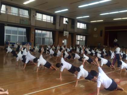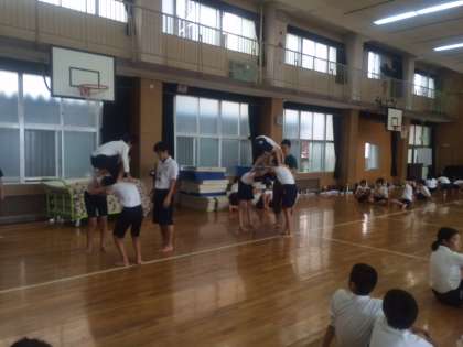 今年の組体操のテーマは、「感謝」。今までの自分を振り返り、多くの方にお世話になったことなど様々な思いを身体表現します。今日は、1人〜3人技の練習です。筋肉痛を少し感じながらも、高学年らしいピリッとした練習風景でした。