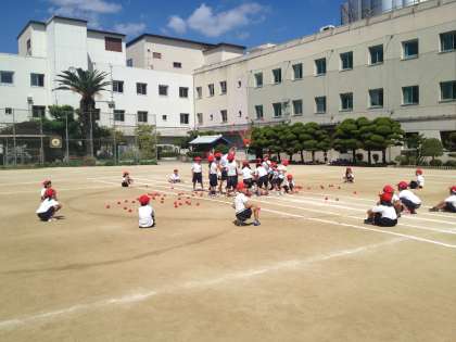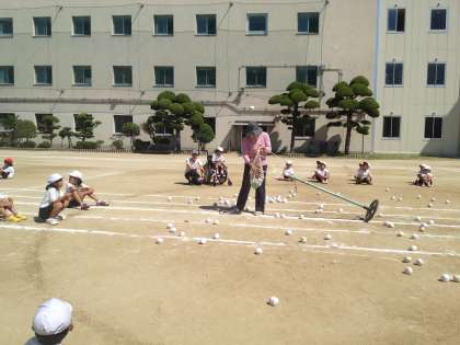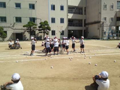 運動場はとても暑かったのですが、みんな元気いっぱい練習しました。終わった後、大きな声で玉の数を数えました。運動会当日は、もう少しかごの高さを高くする予定です。赤も白もがんばれ!!