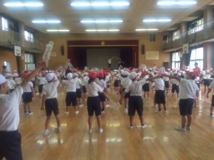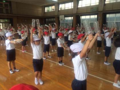 ペットボトルの容器を持って踊っています。今日は涼しくて、練習していても汗をかくことはあまりありませんでした。広い運動場で踊るのが楽しみです。