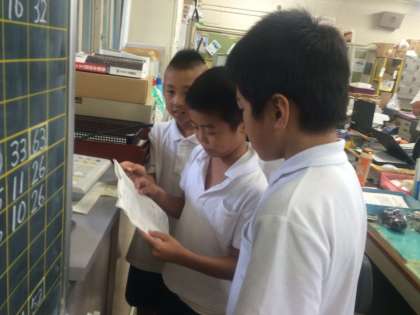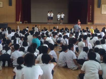 2学期初めての児童集会は、ステレオクイズでした。4人の集会委員が一斉に一文字ずつ発した言葉を縦割りグルーブで当てるゲームです。よく聞いていないとなかなかわかりにくいです。昼休みに、結果発表をしました。