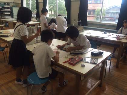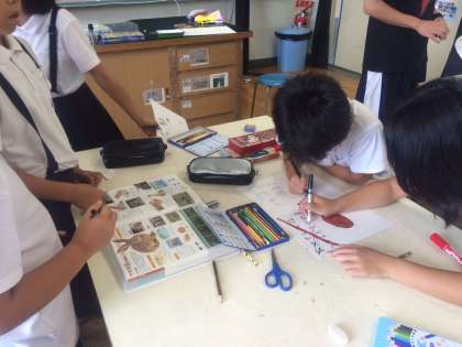 10月に1年生を対象に、ウサギのショコラとふれあう会を計画しています。そのポスターを描いています。また、どんぐりについても調べてお知らせする予定だそうです。どんぐりは、全校遠足でたくさん一年生が拾います。