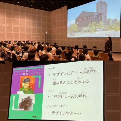 プラネタリウムの後は、少し移動をして中之島美術館へ行きました。中之島美術館は2022年にオープンした新しい美術館です。おしゃれな建物の中に入り、ホールで担当の方からのお話を聞きました。現在開催されている展示は、「デザインに恋したアート、アートに嫉妬したデザイン」ということで、非常にインパクトのあるテーマです。展示を見るポイントや注意を聞いて、ワクワクして展示室へ行きました。