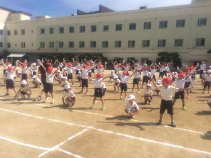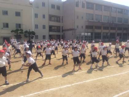 ペットボトルを持って踊っています。少しくらい間違っても、楽しく元気に踊るのが一番です。運動場での自分の位置も大体覚えることができたようです。