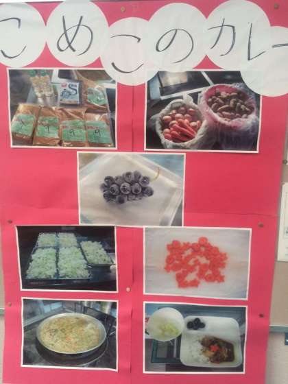 今日の給食は、米粉で作ったカレーでした。掲示板に材料や、盛り付けの写真を貼っています。型抜きの器具をたくさん用意し、ラッキー人参の種類も増やしました。