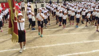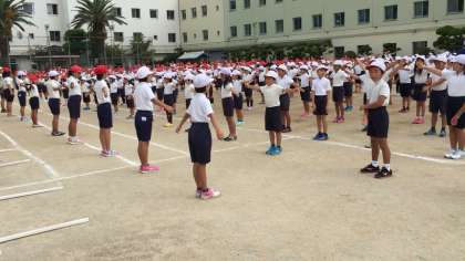 1時間目は行進や整列、体操、開会式などを全校児童そろって練習しました。