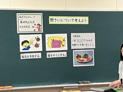 野菜は「病気を予防する」「腸をそうじする」働きがあり、体の調子を整える大切な食べ物です。3年生では、1日300g以上の野菜を食べると良いそうです。給食では100gの野菜がとれるようなので、しっかり給食を食べて、朝食、夕食でも野菜を食べてくださいね。