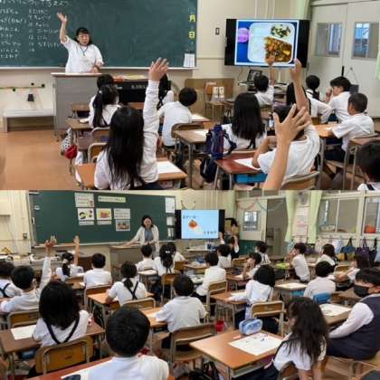今日は3年生が栄養指導として、栄養教諭の先生に来ていただき、授業をしていただきました。3年生の学習テーマは「野菜について考えよう」です。給食の画像を見ながら入っている野菜を答えていきます。たくさんの子どもたちが手を挙げてがんばって答えていました。