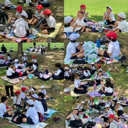 まだまだ遊び足りない様子ですが、お待ちかねのお弁当タイムです。青空の下で食べるお弁当は格別の美味しさですね。美味しい笑顔がいっぱいです。お家の方の愛情が込められたお弁当の数々、子どもたちがとてもうらやましいです。