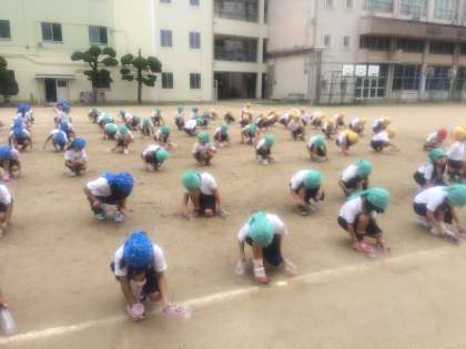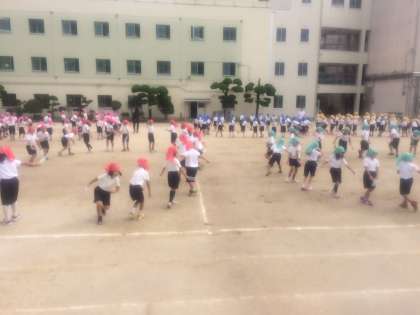 カラフルなバンダナを付けて踊ります。ようやく晴れ間が出てきたので、ダンスの立ち位置を、しっかり練習しました。