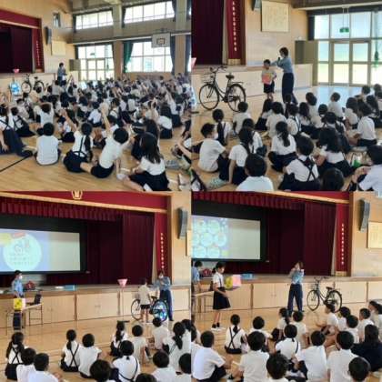 3年生から6年生までは、講堂で自転車の安全な乗り方の指導をしていただきました。自転車は左側から乗って左側通行することやヘルメットをかぶることなどを学びました。サイコロを振ってすごろくをしながら学習していくので、子どもたちはノリノリでした。特にサイコロを振りたいみたいで、たくさんの子どもたちが手を挙げていました。今日学んだことを生かして、交通ルールやマナーを守って安全に自転車乗ってほしいと思います。