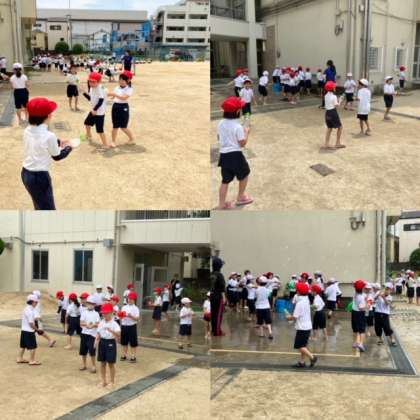 1年生が生活科の学習「みずであそぼう」で、水鉄砲、シャボン玉、どろ遊びを楽しみました。3クラスで3つの遊びをローテーションして、全員がすべての遊びを体験しました。