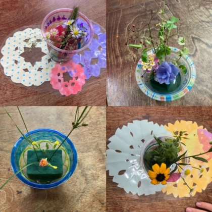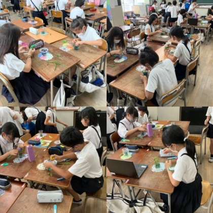 4年生が「野草生け花」を制作していました。校内の野草を使っておしゃれな生け花です。みんな選ぶ野草も違うし、生け方もさまざま、色もスタイルも自分流、みんな違ってみんないいです!