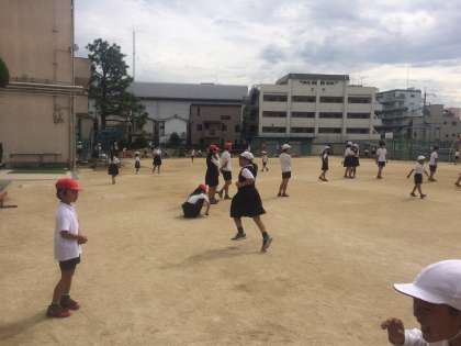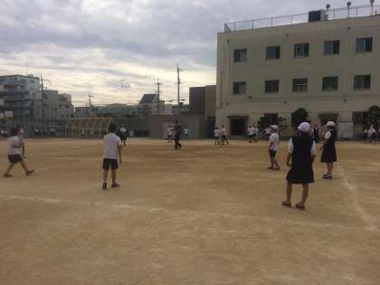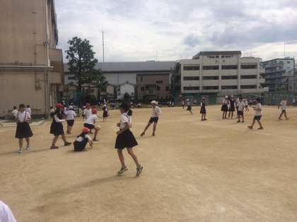 運動場でたくさんの子どもたちが遊んでいました。鬼ごっこやドッジボール、遊具など様々な遊びを楽しんでいます。がらんとして見えるのは、人数の割に運動場が広いからです。