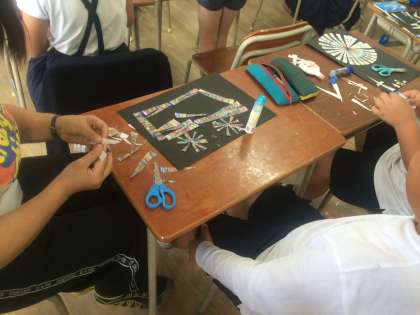 色を塗った円を細かく分けて切り、デザイン模様を作りました。花火、車など楽しみながら仕上げました。
