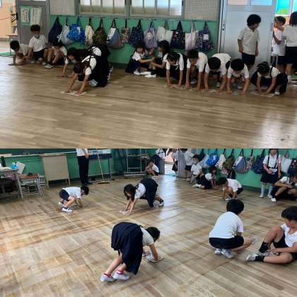 1学期もいよいよ終了ということで、教室をきれいにしています。1年生では机を全部廊下に出して、みんなで掃き掃除と拭き掃除をがんばっていました。
