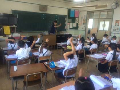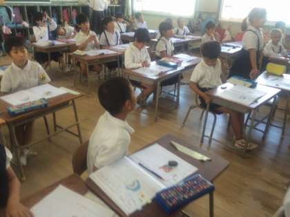 新しく習う漢字がたくさん出てきています。でも1年生は興味いっぱいで、うれしそう。習った漢字を使ったことばや文作りをしながら覚えていきます。空書きで大きく書いて練習もしています。