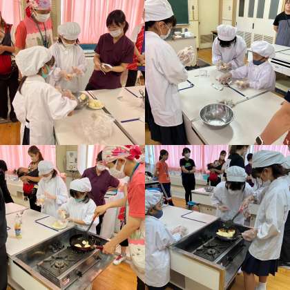 今日は「ウリナラクラブ」の夏季活動としてホットク作りをしました。ホットクは韓国屋台で人気の伝統的なおやつです。子どもたちは楽しく調理にチャレンジ!ほどなく家庭科室は良い匂いが・・・教職員もたくさん参加して楽しく活動できました。