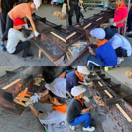 班で協力してカマドの火をおこしています。なかなか難しくみんな苦労しています。改めてガスや電気のありがたさを感じますが、これも貴重な経験ですね。