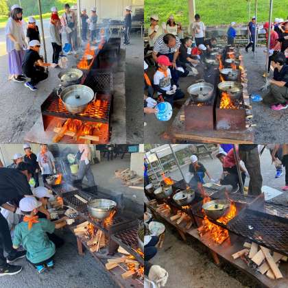 なんとかカマドに火がついて、カレーのお鍋をグツグツ煮込んでいます。子どもたちは自分の班の鍋の様子を心配そうに見守っています。さて、美味しいカレーができるのでしょうか?