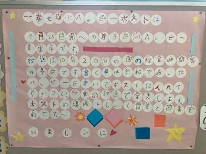 今日の朝は、児童集会を放送で行いました。最初に運営委員会よりのお知らせがありました。来週9月25日(月)〜10月3日(火)の期間に、学校であったハッピーなことを書いてポストに入れてくださいというお知らせです。そのハッピーな出来事は給食の時間に放送で発表するとのことで、どんなハッピーがあるかとても楽しみです。