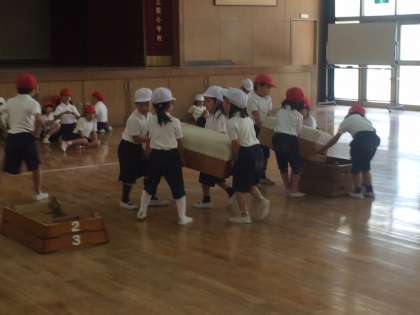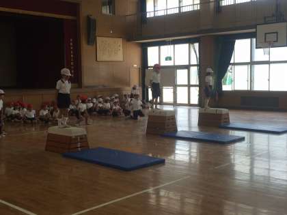 とび箱に親しむ(なかよしになる)活動をしました。ピョンと飛び乗って、ハイ、ポーズ!!次の人に合図を送ります。とび箱やマットの片付けもみんなで協力して危なくない運び方を勉強しました。11月から体育館が工事に入ります。それまでたくさんとび箱やマットとなかよしになりですね。
