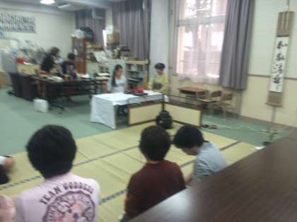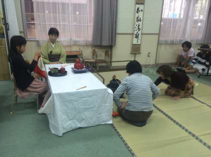 生け花教室の後は、茶の湯教室です。こちらは、図書ボランティアなど育みネットでお世話になっている佐藤先生にご指導いただいています。西三国小の子どもたちや、卒業生が習いに来ています。袱紗捌きも見事です!