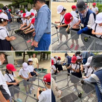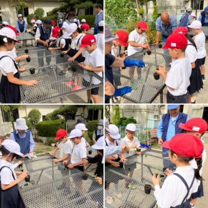 「地域とのふれあい活動」として、2年生は前回キンセンカの種をまきましたが、今日は発芽して少し育った苗を少し大きなポットに移し替える「鉢上げ」の作業をしました。今回も地域の種苗ボランティアの皆さん、公園事務所の皆さんにお世話になりました。子どもたちは、苗をピンセットでつかむのが難しそうでしたが、皆さんに優しく教えていただき、無事に鉢上げが完了しました。キンセンカの成長がとても楽しみです。