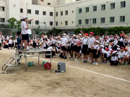 今日は「じゃんけんゲーム」です。朝礼台の集会委員とじゃんけんをして、例えば「負けてください」と集会委員が言ってじゃんけんをしたら、集会委員に負けた人が勝ちになります。最後まで残った人に全員で拍手をしました。3回戦行い全校生で楽しみました。