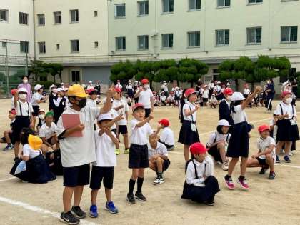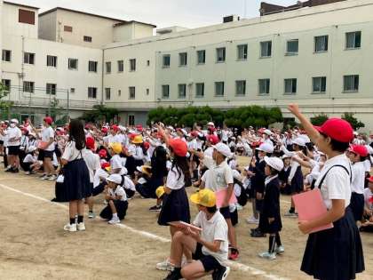 木曜日の朝は児童集会です。運動場に縦割り班で集合しました。工事の事務所などが撤去され、運動場が広くなりました。
