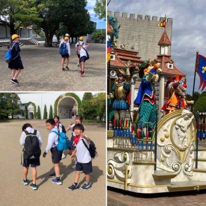 スペイン村班行動では、班ごとにミールクーポンで昼食をとって、子どもたちは園内でお楽しみ中です。パレードもあり、盛り上がっています。