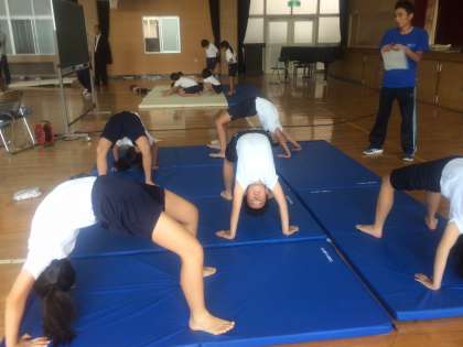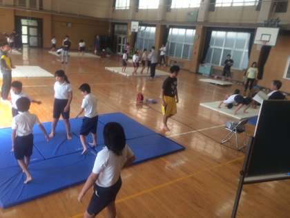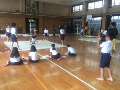 今日の目当てを確認した後、6つと班に分かれて目当てに沿って練習をしました。タブレットで撮った自分の技や、全体のバランスを確認し、再度挑戦です。1時間の終わりには、ペアグループで交流、評価しあいました。