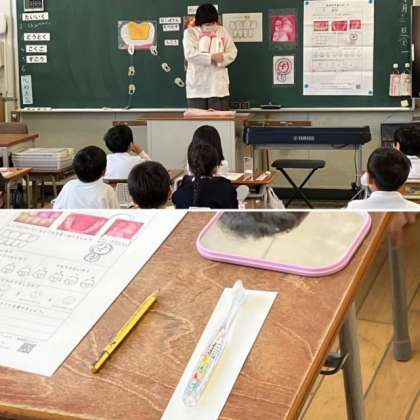 子どもたちに、どうして虫歯になるかを分かりやすく教えていただき、正しい歯の磨き方を教えていただきました。子どもたちはお話をよく聞いて、歯ブラシを横にしたり縦にしたりして、磨き残しの少ない磨き方を学びました。早速、今日から実践してみてくださいね。