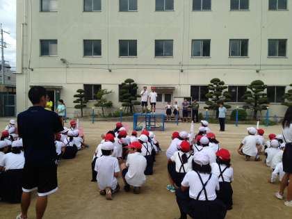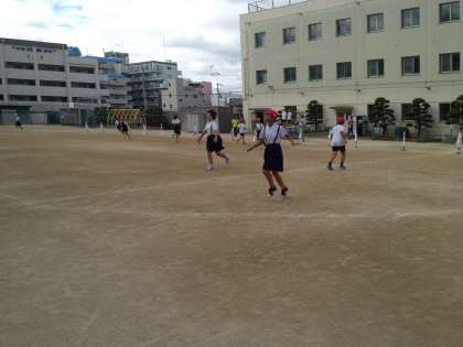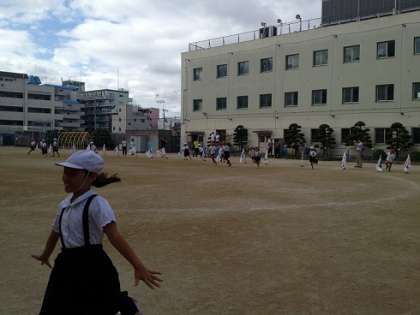 今日のゲームは、低学年がカニに、中学年がペンギン、高学年が鳥になって走るというゲームです。高学年の児童もちっとも恥ずかしがらず、楽しんでいる姿はほほえましいです。リーダーは、下の学年の様子も見ながらアドバイスをしたり、ほめたりしています。西三国小学校のよき伝統の一つです。