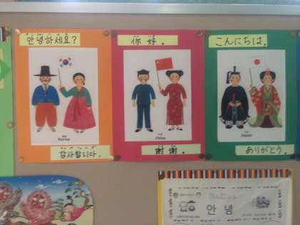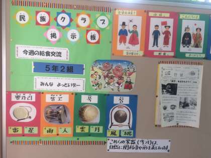 玄関を入ってすぐ、管理作業員さんの部屋の前あたりに掲示板を作っています。ソンセンニムとの交流給食の予定も知らせています。いろいろな国のあいさつも掲示しています。