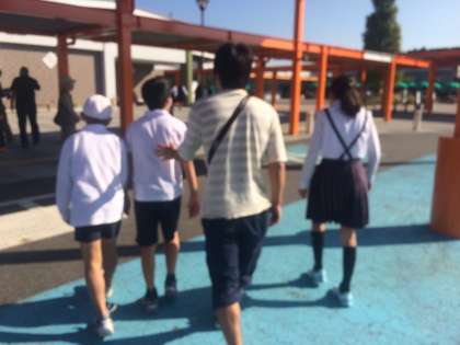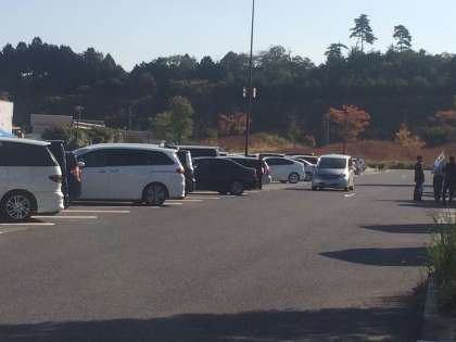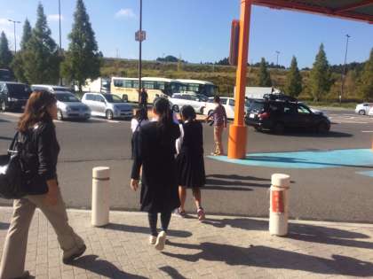 土山サービスエリアで休憩です。周りは少し紅葉していてきれいです。眠たそうな子もいますが、子どもたちは歌を歌って元気です。