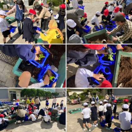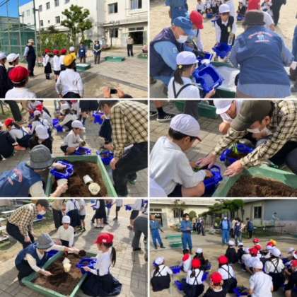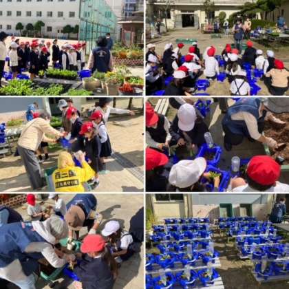 花苗ボランティアの方、公園事務所の方と一緒に、それぞれの子どもたちの鉢にキンセンカを植え替えます。たくさんの地域の皆さんがいろいろと教えてくだり、また皆さんとの温かいふれあいを通して、子どもたちは楽しく活動ができました。