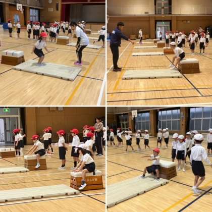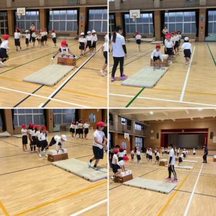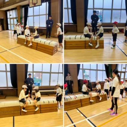 体操のコーチに来ていただき、1年生でとび箱の出前授業をしていただきました。チーム対抗でとび箱の上でじゃんけんゲームをして、楽しみながらとび箱の手のつき方や体の使い方を練習しました。続いて、とび箱のとび方も1つ1つの動きを段階を踏みながら、楽しく練習をしていきました。最後はとび箱がとべるようになった子がたくさんいました。とび箱をとび越えることができた時は、とてもうれしそうです。「できた!」が次への意欲につながりますね。