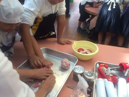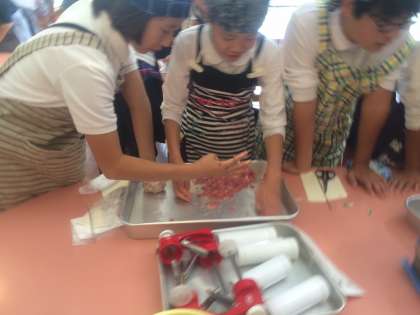 手作りウインナー体験の時間です。豚肉をこねこねして、袋につめていきます。