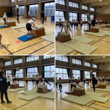 体操のコーチに来ていただき、5年生でとび箱の出前授業をしていただきました。教えていただいたのは、開脚とびです。きれいな開脚とびができるように、ポイントをおさえながら、ステップを踏んで練習をしていきます。個別にもアドバイスをしてもらい、練習していくとコツをつかんで上手にとべるようになっていきました。