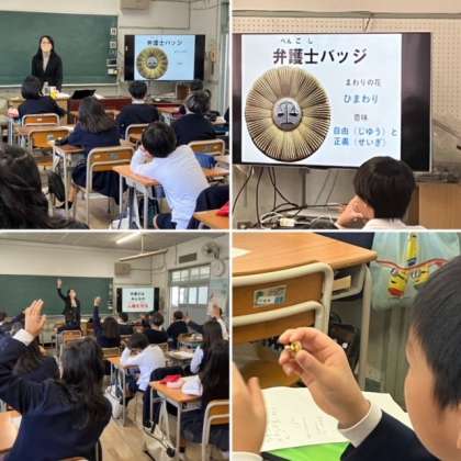 また、日ごろあまり接する機会がない弁護士の先生ということで、子どもたちは弁護士という仕事にも興味を持っていていろいろと質問をしていました。弁護士バッチを触らせていただいたり、法律の分厚い本を見せていただいたりというのも貴重な経験になったのではないでしょうか。今日の学習でみんなの人権を守る弁護士になりたいという気持ちになった人がいれば嬉しいです。